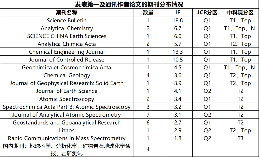 在国内外重要期刊上发表第一作者或通讯作者论文40篇,和他人合作共计发表SCI论文60余篇,论文他引2200余次,H0index=35.0。担任Analytical Chemistry(T1)、Chemical Geology(T1)、Journal of Analytical Atomic Spectrometry(T2)、Geostandards and Geoanalytical Research(T2)、Analytica Chimica Acta(T2)等多个国际高水平SCI期刊的评审专家,获得Journal of Analytical Atomic Spectrometry(T2)2023和2024年优秀评审专家称号(Outstanding Reviewer 2023 and 2024)。获批两项国家自然科学基金面上项目,并作为技术骨干参加2次科技部国家重点研发计划,一次国家自然科学基金委员会,国家重大科研仪器研制项目。2020年获得湖北省科学技术奖一等奖(排名第三),2022年获得中国分析测试协会科学技术奖一等奖(排名第二)。获得国家发明专利授权12项,软件著作权3项。多次在重要学术会议担任“分析地球化学研究进展”方面的召集人,并做“地质样品分析前沿技术”相关主旨/邀请报告(10次)。获得中国地质大学“地大学者”青年拔尖人才项目资助。