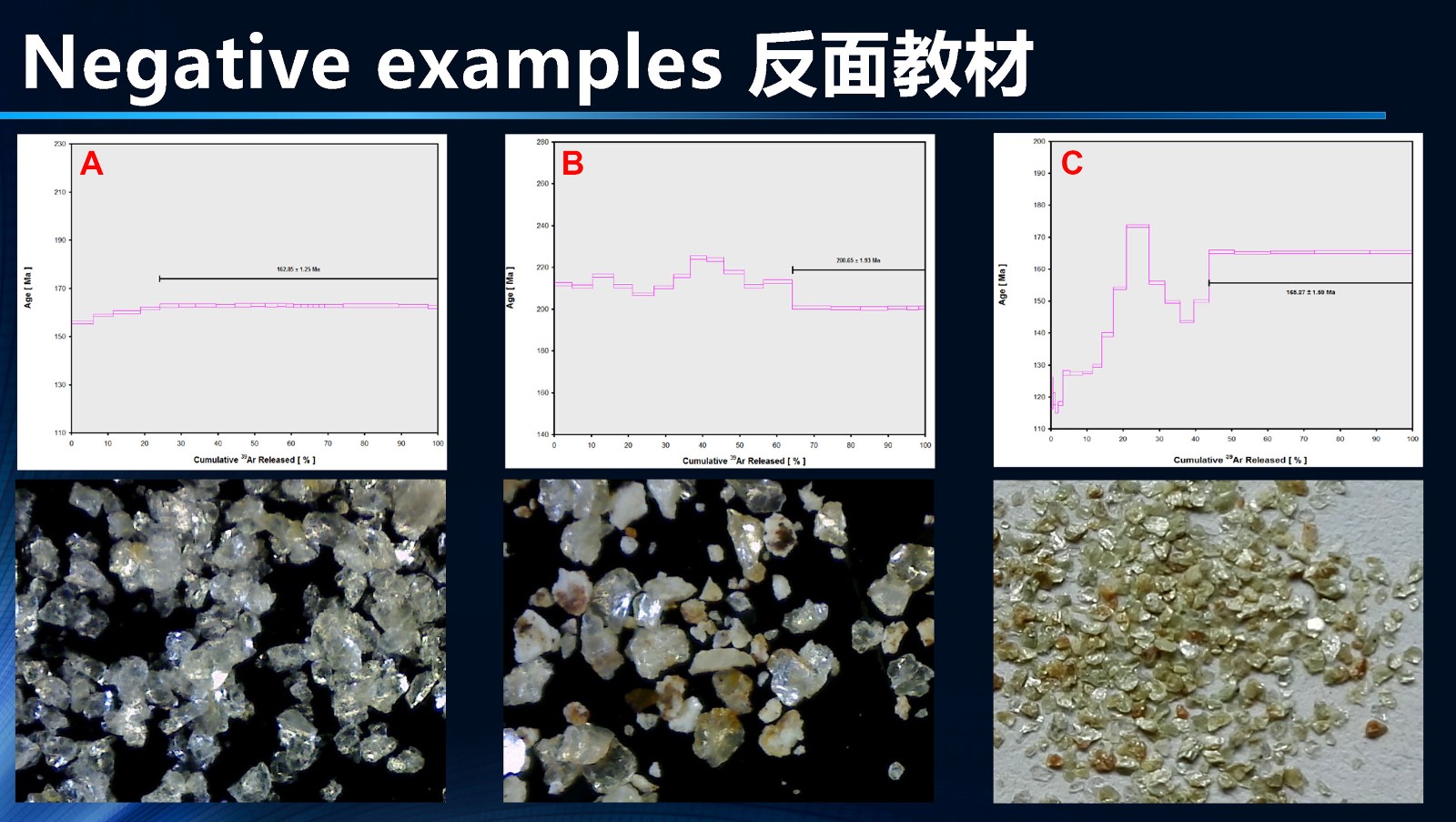 单矿物须在双目镜下手工挑选,纯度达到 99% 以上,才能获得高质量的 Ar-Ar 年龄数据。