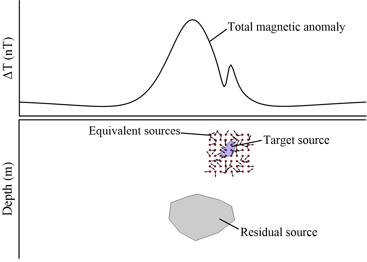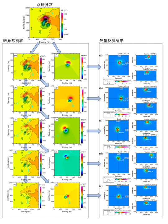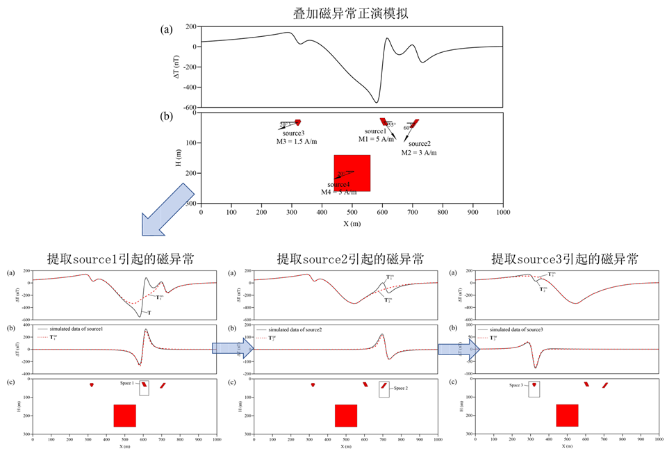 该研究成果的提出为了实现从复杂磁异常叠加及相干环境中恢复目标场源引起的磁异常。其中,磁异常叠加的复杂性主要体现在以下三种情况:(1)复杂剩磁环境中各场源间总磁化方向不同且未知;(2)目标场源引起的磁异常受旁侧强磁性场源干扰发生严重结构性畸变;(3)不同埋深磁性场源引起的多频段磁信号叠加。