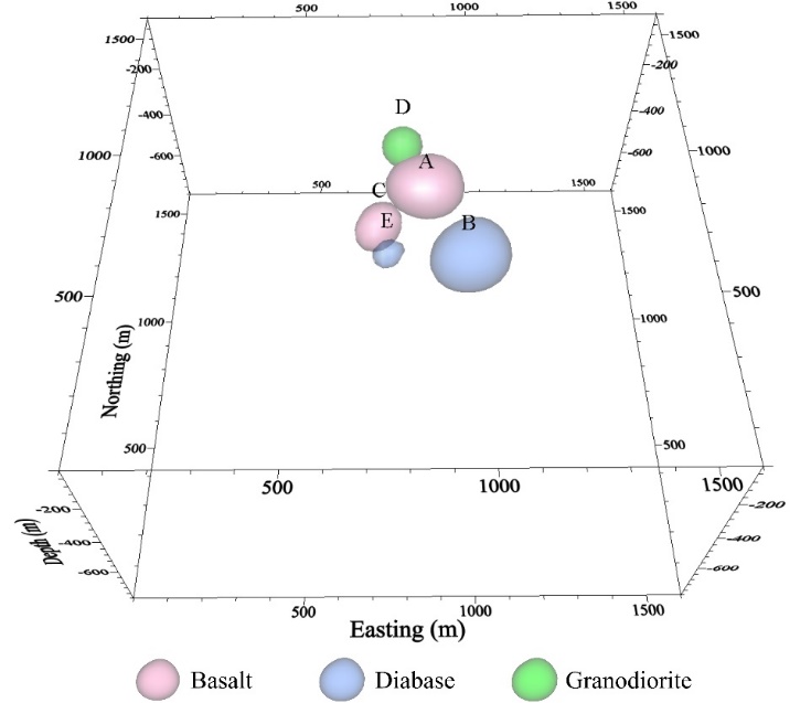 本文方法被用于实际磁异常研究。研究区中心磁异常(见图3)整体呈北正南负,与地磁场方向相反,并受西低东高背景场叠加。此外,可以看出该倒转磁异常由多个不同磁化方向场源共同引起。利用磁异常提取先后获得5个不同场源(分别由场源A-E表示)引起的磁异常,采用矢量反演分别得到场源A-E的空间磁性矢量分布(图3)。根据反演得到的各场源磁化强度和方向,并结合研究区岩石样本物性统计特征,推断场源A和C为具有强磁性和强剩磁的玄武岩,场源B和E为辉绿岩,场源D为花岗闪长岩。最终,得到地下隐伏空间火成岩分布如图4所示。