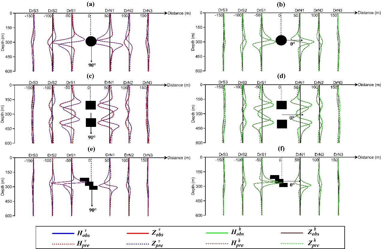 井中磁测测量磁场的三个分量,并且对磁源的垂向深度敏感,在深部矿产资源勘查中起着重要作用。频率域位场转换是地面和航空磁异常重要的数据处理方法,但很少应用于井中磁数据,这为井中磁数据的处理带来了困难,影响了井中磁测的进一步反演和解释。Gerovska等 (2009) 提出可以利用转换的化极 (RTP) 磁场和磁异常振幅 (Ta) 的相关系数来估计地面磁数据的总磁化方向。我们将该方法应用于井中磁数据,利用转换的磁分量与磁异常振幅的相关系数估计磁化方向。