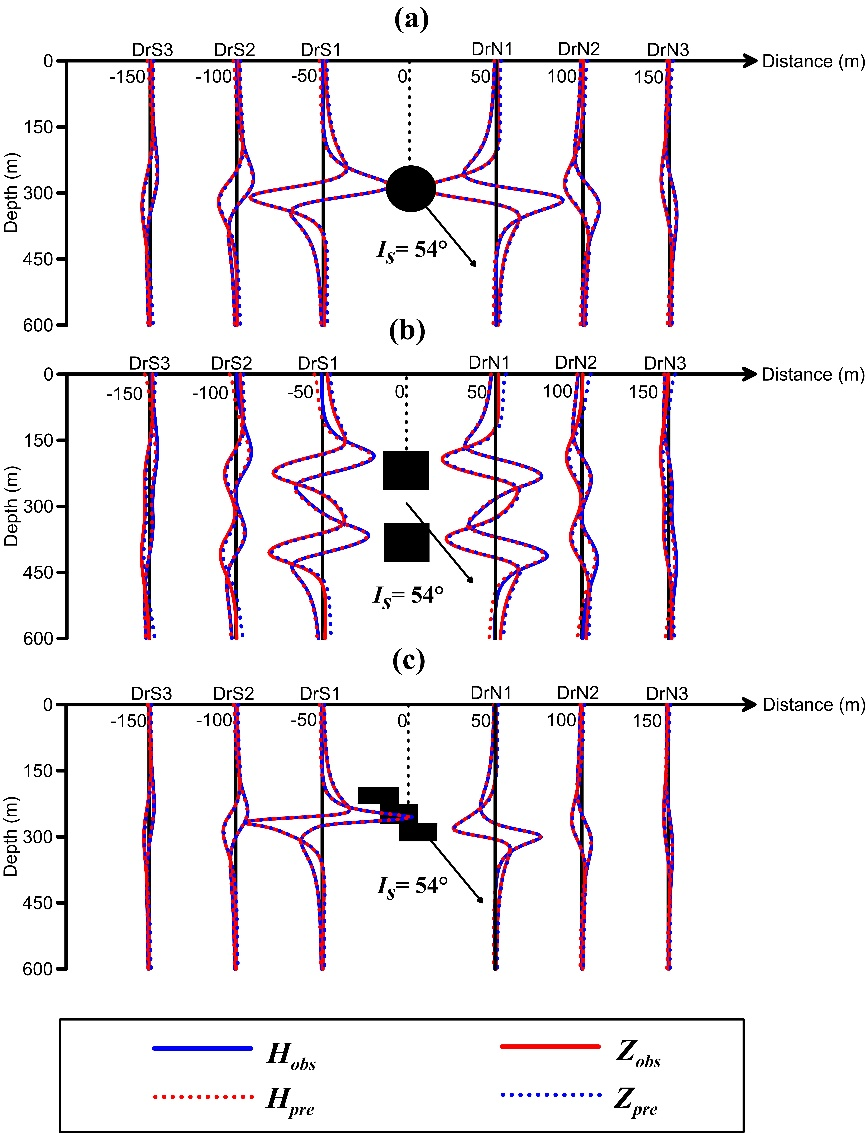图3 不同模型验证井中磁数据的分量变换和磁化方向变换的有效性