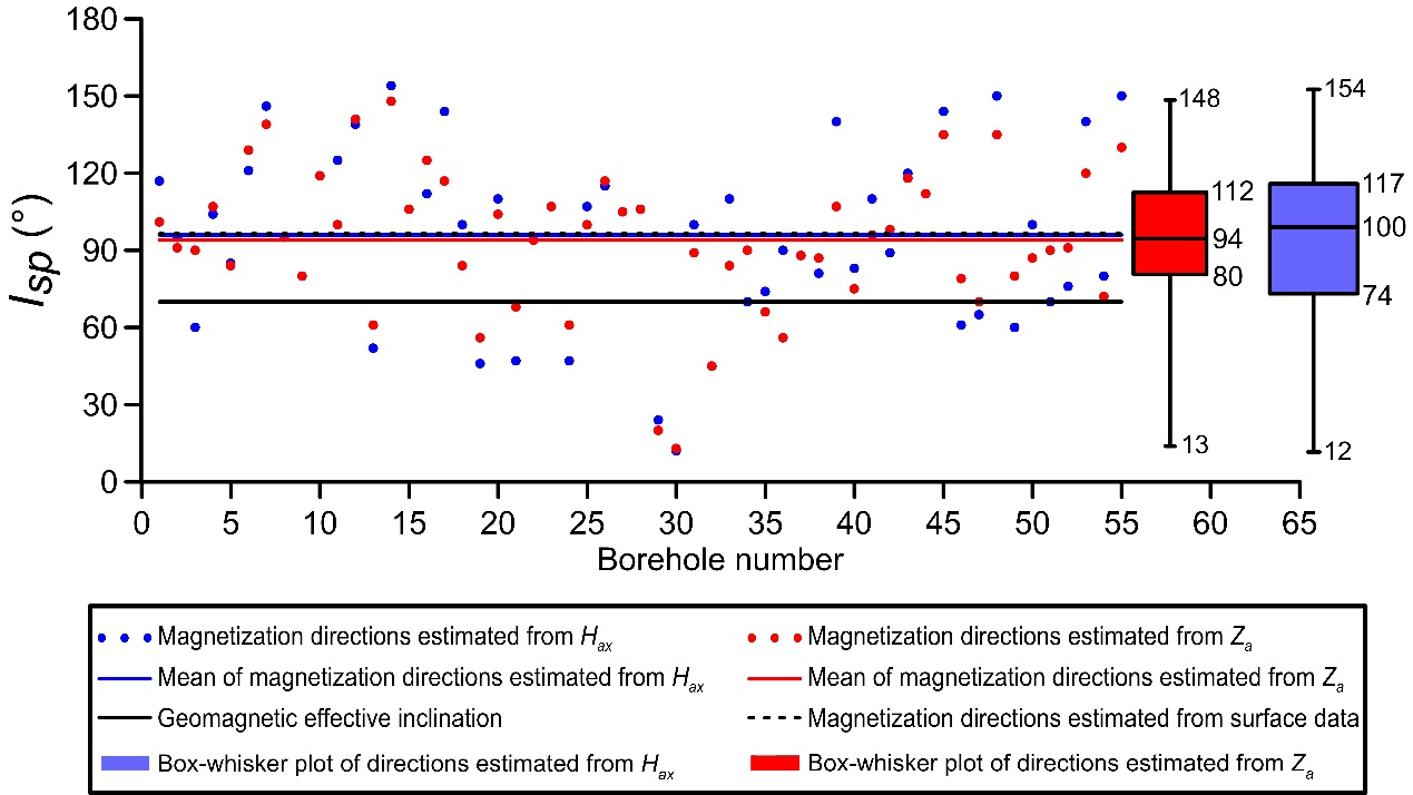 图4 蒙库铁矿区55个钻孔井中磁测数据估算的有效磁化倾角