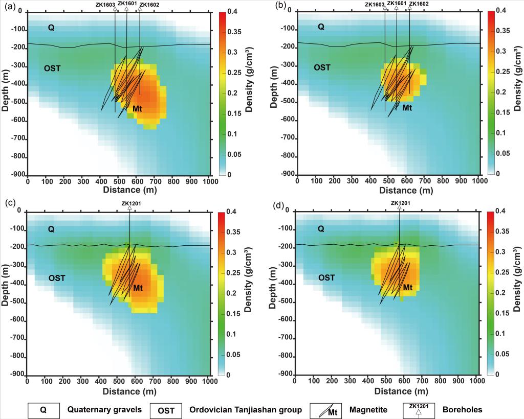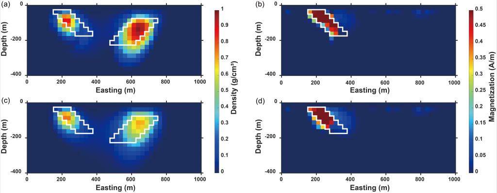 图3 (a)联合成像密度模型,(b)联合成像磁化强度模型,(c)单独成像密度模型,和(d)单独成像磁化强度模型