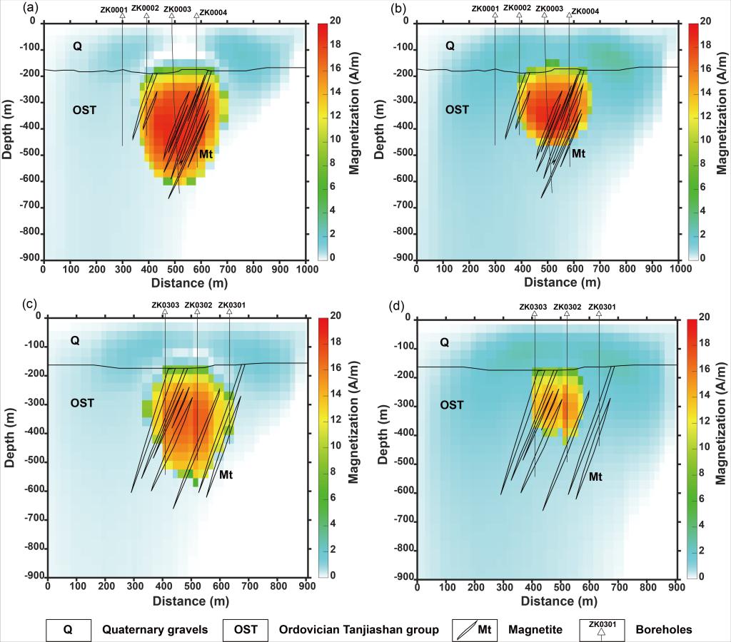 图5 (a)联合成像磁化强度模型截面,(b)单独成像磁化强度模型截面,(c)联合成像磁化强度模型截面,(d)单独成像磁化强度模型截面