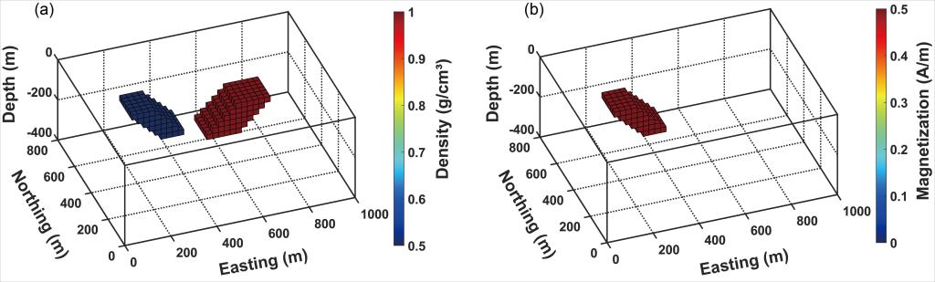 图2 模型(a)密度和(b)磁化强度分布