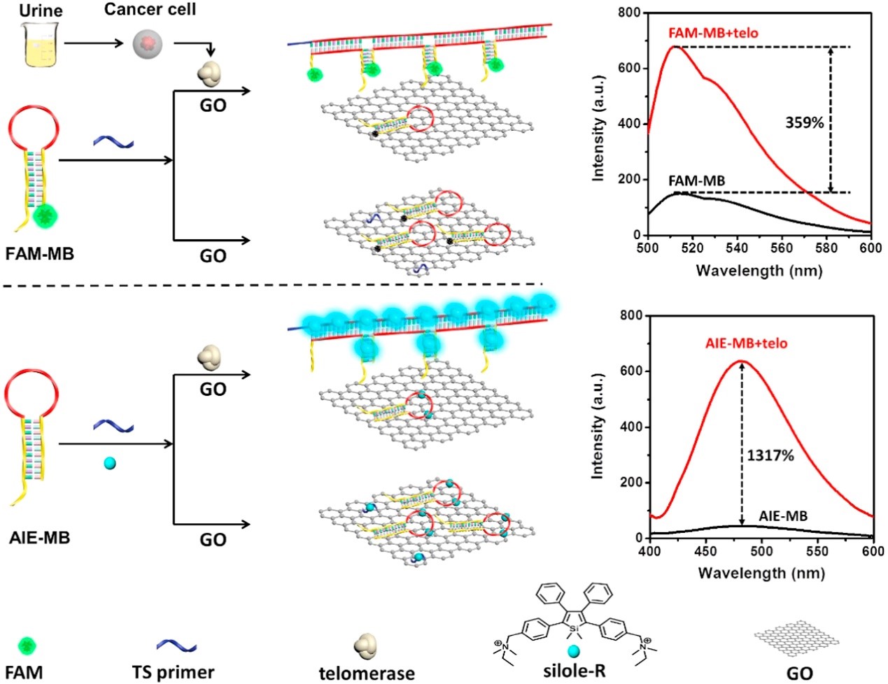Ou, Xiaowen, Hong, Fan, Zhang, Zhenyu, Cheng, Yong, Zhao, Zujin, Gao, Pengcheng, Lou, Xiaoding(*), Xia, Fan and Wang, Shutao. A highly sensitive and facile graphene oxide-based nucleic acid probe: label-free detection of telomerase activity in cancer patient's urine using AIEgens. Biosensors & Bioelectronics, 2017, 89, 417-421.