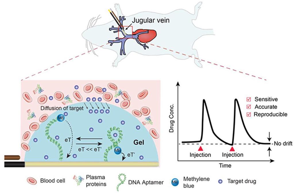 Li, Shaoguang, Dai, Jun, Meng, Zijuan, Netzahualcóyotl, Arroyo-Currás, Li, Hongxing, Wang, Yuanyuan, Wang, Quan, Lou, Xiaoding*, Tod E. Kippin, Wang, Shixuan, Kevin, W. Plaxco*, Li, Hui*, and Xia, Fan. Implantable Hydrogel-Protective DNA Aptamer-Based Sensor Supports Accurate, Continuous Electrochemical Analysis of Drugs at Multiple Sites in Living Rats. ACS Nano 2023, 17, 18, 18525–18538.