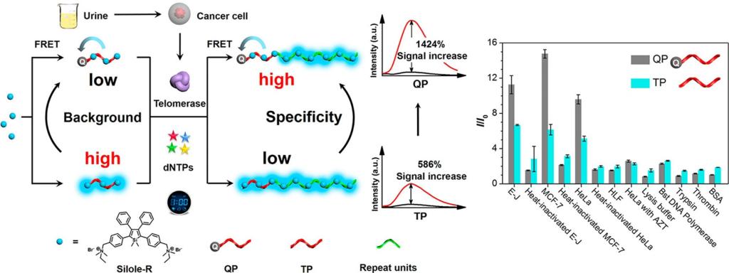 Zhuang, Yuan(#), Xu, Qi(#), Huang, Fujian, Gao, Pengcheng, Zhao, Zujin, Lou, Xiaoding(*) and Xia, Fan. Ratiometric fluorescent bioprobe for highly reproducible detection of telomerase in bloody urines of bladder cancer patients. ACS Sensors, 2016, 1 (5), 572-578.