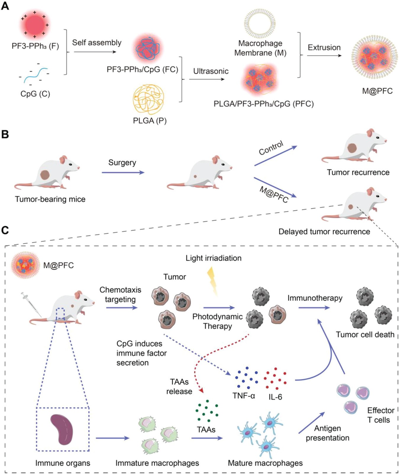 Zijuan Meng, Tingting Wang, Yuxin Hu, Hanzhi Ouyang, Quan Wang, Meng Wu, Jian Zhou, Xiaoding Lou*, Shixuan Wang, Jun Dai*, Fan Xia*. Macrophage Membrane-Camouflaged Aggregation-Induced Emission Nanoparticles Enhance Photodynamic-Immunotherapy to Delay Postoperative Tumor Recurrence. Advanced Healthcare Materials, 2023: 2302156.